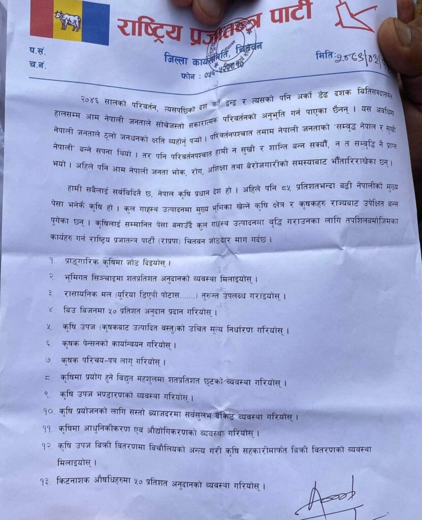 चितवन । राष्ट्रिय प्रजातन्त्र पार्टी जिल्ला कार्य समिति चितवनले किसानकाे हितमा काम गर्न माग गरेकाे छ ।
