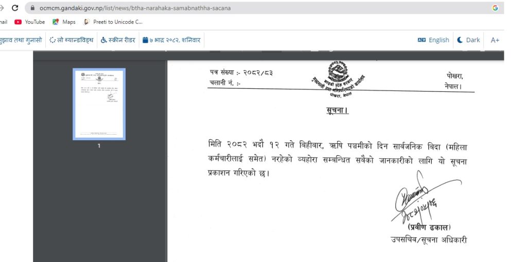 भदौ ७, गैँडाकोट । ऋषि पन्चमीमा महिलाहरुलाई पनि बिदा नदिएपछि गण्डकी प्रदेश सरकारको आलोचना बढेको छ । मुख्यमन्त्री तथा मन्त्रिपरिषदको कार्यालय पोखराले एक सूचना जारी गर्दै ऋषि पन्चमीमा महिलाहरुलाई पनि बिदा नरहेको सूचना जारी गरेको हो ।